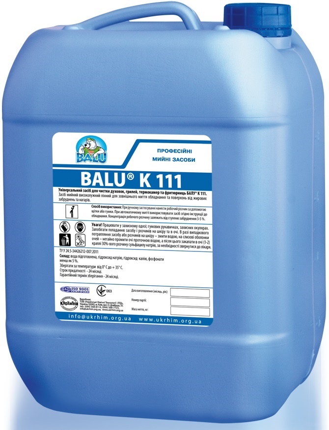 БАЛУ К-111 – універсальний лужний пінний засіб, спеціально розроблений для ефективного очищення обладнання та поверхонь від застарілого жиру, нагару та сажі. Призначений для регулярного чищення духовок, грилів, фритюрниць, пароконвектоматів та камінів.