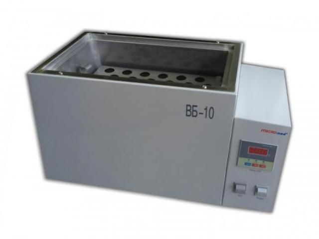 Баня водяна лабораторна ВБ-10 Баня БВ-10 призначена для нагріву і термостатування вмісту при проведенні аналізів і досліджень, які потребують постійної температури. Баня водяна лабораторна ВБ-10 призначена для використання в різних науково-дослідних і промислових лабораторіях. Баня ВБ-10 складається з корпусу, робочої камери з нержавіючої сталі, мікропроцесорного блоку управління, цифрового датчика температури, нагрівального елементу і кришки. На лицьовій панелі лазні ВБ-10 розташовані вимикач і мікропроцесорний блок управління. Установка температури проводиться на сенсорному табло з точністю 0,1 ° С. Для захисту від механічних пошкоджень електронагрівач закритий зверху захисною кришкою. Мікропроцесорний блок управління керує роботою нагрівальних елементів, виробляючи включення і виключення для досягнення і стабілізації заданої температури. Контроль температури всередині камери проводиться цифровим вбудованим термометром з дискретністю 0,1 ° С. На цифровому індикаторі відображається реальна і встановлена ​​температура, режим роботи нагрівальних елементів. У комплект поставки входить штатив для пробірок 30 гнізд, виготовлений з нержавіючої сталі. У лабораторії штучного осіменіння свиней застосовується з метою підігріву демінералізованої води для приготування розчинника сперми кнурів. Зручне використання в лабораторіях штучного осіменіння свиней у всіх сільськогосподарських підприємствах. Призначена для розміщення двох скляних літрових колб або декількох поліетиленових мішків обсягом не більше 3,5 л.