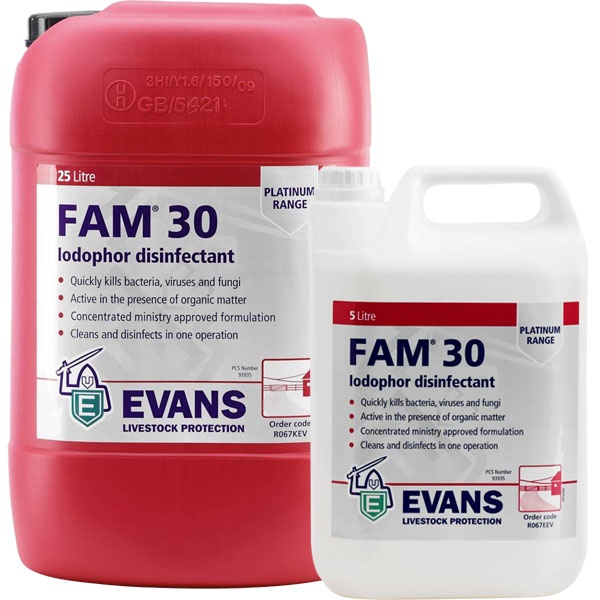FAM 30 – високоефективний дезінфекційний засіб на основі йоду, призначений для знезараження поверхонь, обладнання, приміщень, транспорту та інвентарю в агропромисловому секторі, ветеринарії, харчовій промисловості та медичних установах. Засіб має широкий спектр антимікробної дії, ефективно знищує бактерії, віруси, гриби та спори.