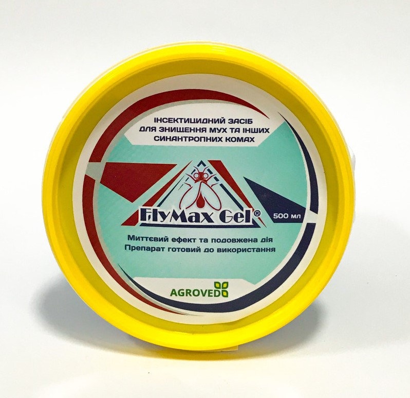 Інсектицидний гель проти мух та інших синатропних комах. Застосовується для боротьби з мухами, мурахами, тарганами та ін. комахами. Застосовується на підприємствах харчової промисловості, в тваринництві, в сфері обслуговування, в приватному секторі для ефективної боротьби з населенням мух, ос, тарганів і ін. синатропних комах. Засіб повністю безпечний для всіх видів ссавців (людей, тварин), що в свою чергу дозволяє проводити обробку в присутності людей і тварин. Ефект проявляється через 2 години після нанесення. ФлайМакс Гель проявляє свої корисні властивості протягом 6 тижнів після обробки.