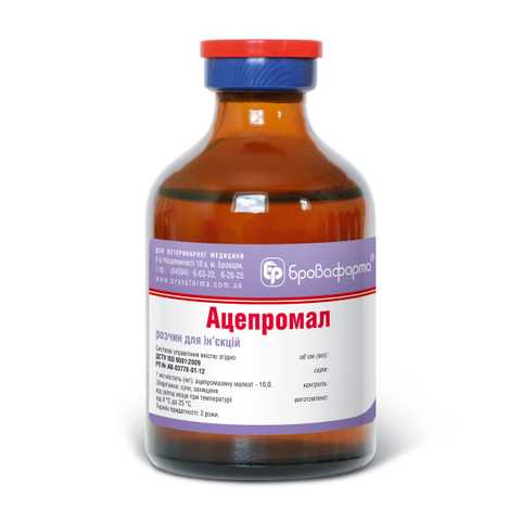 Ацепромазину малеат — нейролептик із групи фенотіазинів, препаратів седативної дії. Розчин для ін’єкцій 1% забезпечує заспокійливу і міорелаксантну дію через зменшення збудження центральної нервової системи. Водночас препарат має гіпотермічну, гіпотензивну, протигістамінну, адренолітичну, спазмолітичну, протиблювальну дію, посилює снодійні та місцево анестезуючі засоби. При внутрішньовенному введенні дія препарату проявляється через 5-8 хвилин, а при внутрішньом’язовому — через 15-25 хвилин. Заспокійливий ефект триває до години. При парентеральному введенні швидко проникає в усі тканини, метабилізується в печінці, виводиться через нирки.
