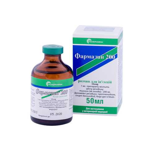 Тилозин - антибіотик з групи макролідів, активний відносно більшості грампозитивних і деяких грамнегативних бактерій, у тому числі стафілококів, стрептококів, коринебактерій, клостридій, пастерелл, еризипелотрикс, спірохет, хламідій, трепонеми хіодізентеріі і мікоплазм. При введенні внутрішньом'язово антибіотик добре всмоктується з місця ін'єкцій в кров і проникає практично в усі органи і тканини організму. Найбільш високий рівень тилозина досягається в легенях, печінці, молочних залозах і нирках. Після одноразової ін'єкції терапевтична концентрація антибіотика зберігається в організмі протягом не менше 20 годин. Крім цього, завдяки особливостям механізму дії, Фармазин 50 вибірково накопичується в тканинах з низькими значеннями рН, тобто в осередках запалення, забезпечуючи цілеспрямований ефект. Фармазин 50 проявляє також неспецифічне імуностимулюючу та імуномодулюючу дію завдяки зниженню цитокінів, активації плазматичних клітин і продукції антитіл, активації хемотаксису лейкоцитів і проліферації лімфоїдних елементів. Фармазин 50 у виключно високих концентраціях накопичується в лізосомах нейтрофілів, забезпечуючи завершеність фагоцитозу і швидке позбавлення від бактеріальних патогенів. Особливий склад органічного розчинника в ін'єкційному Фармазин забезпечує високу стабільність при зберіганні, оптимальну консистенцію для комфортного наповнення шприца і абсолютно безболісні для тваринного ін'єкції. Препарат виводиться з організму в основному з калом, в менших кількостях з сечею і молоком.