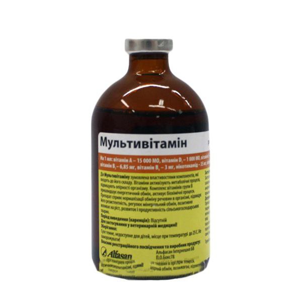 Мультивітамін ін'єкційний є комплексом жиро- і водорозчинних вітамінів. Вітаміни беруть участь у метаболізмі в якості каталізаторів і необхідні для забезпечення нормальної функції організму. , що розвиваються на їх тлі, а також у період реабілітації після хвороби та як підтримуючий засіб для ослаблених тварин.