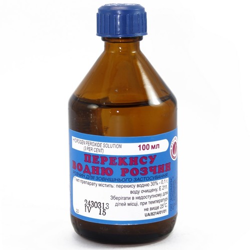Склад лікарського засобу: діюча речовина: водню пероксид; 40 мл розчину містять водню перекису (30 %) 0 10 г; допоміжні речовини: натрію бензоат (Е 211) вода очищена.